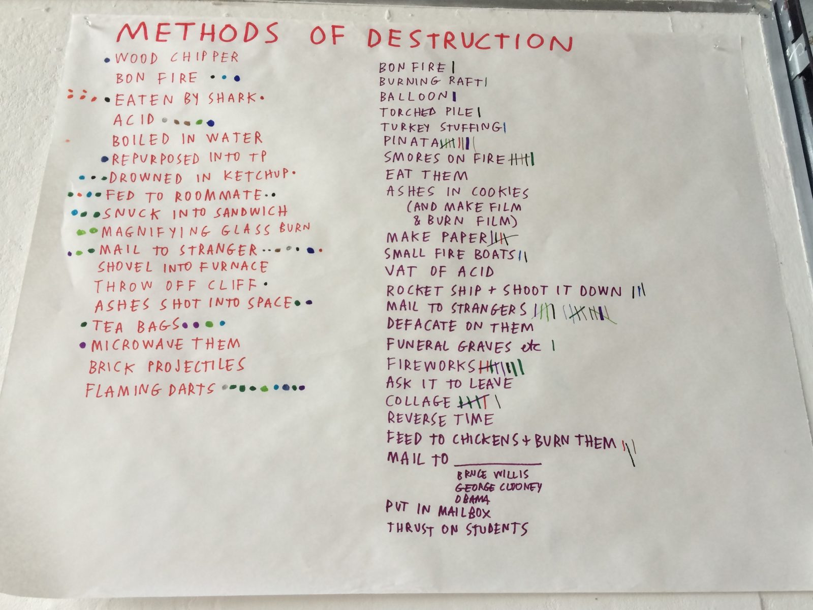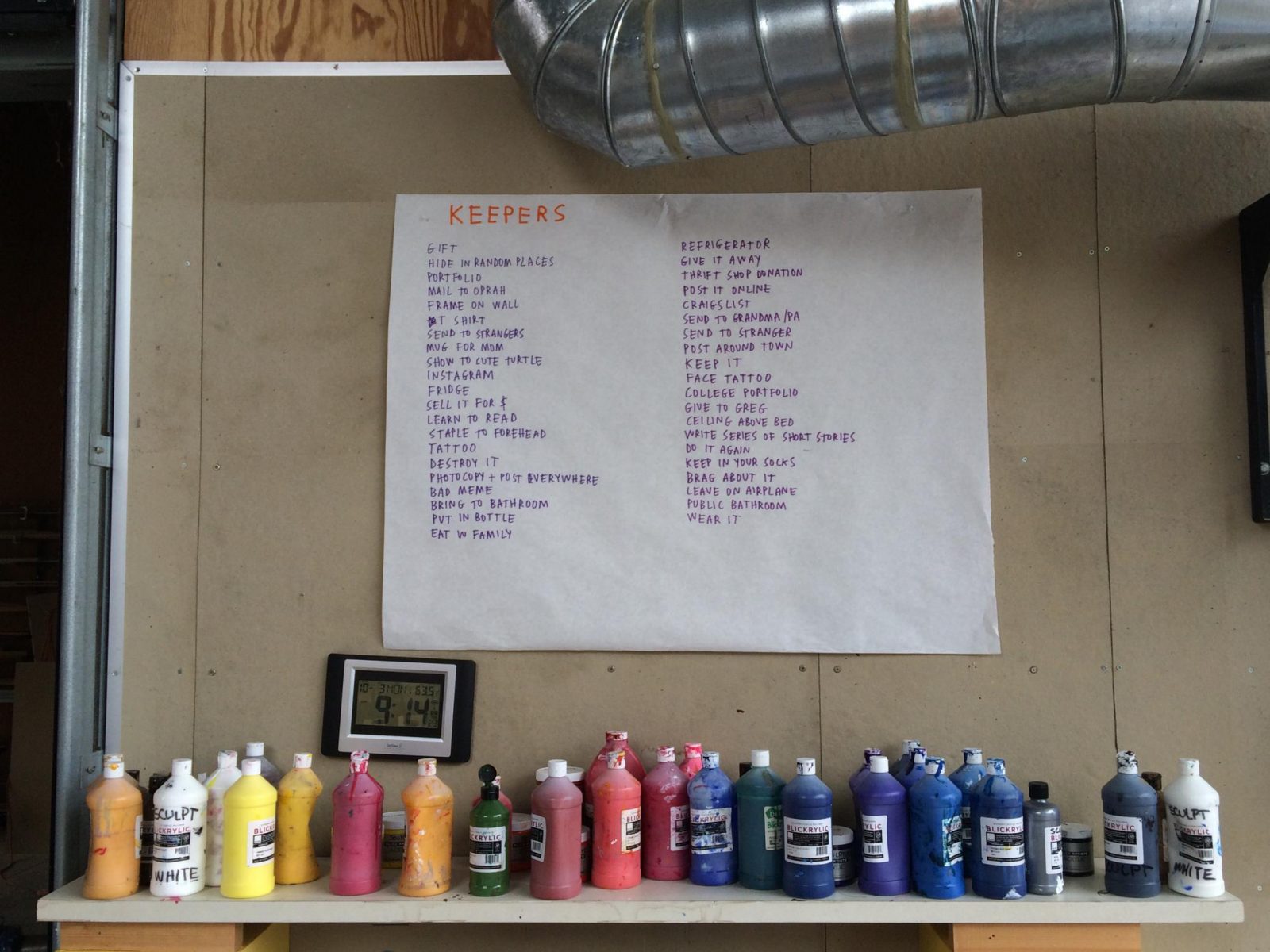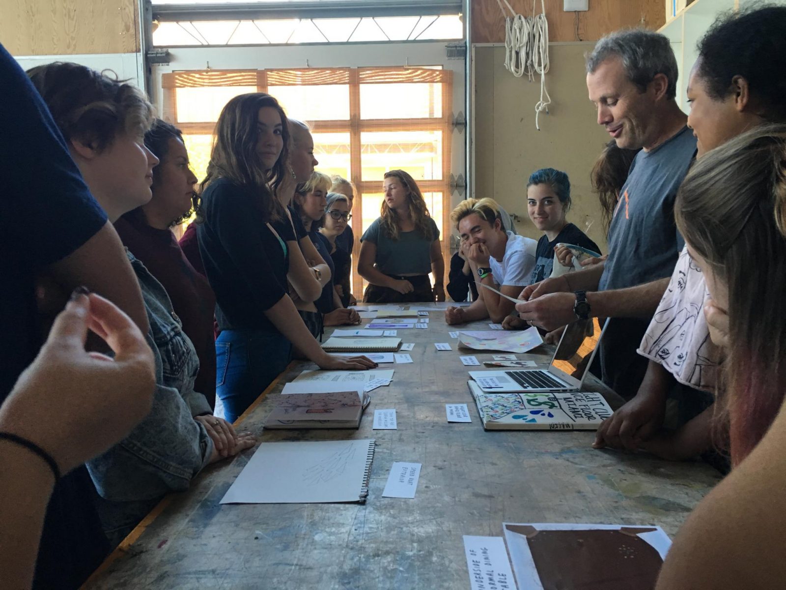 More interesting conversations were sparked by our visiting artist, Tucker Nichols. Tucker's artwork spans a variety of styles, including paintings, sculptures, book illustrations and wall-sized works, but his focus with us at Oxbow started with drawings - lots of them. He encouraged us to make lots of drawings, and much of what we did in his classes included generating ideas. We came up with lists of elaborate ways to destroy art that we don't like, and things to do with art that we do like. Every class we would come prepared with as well as produce drawings, and after sharing would sort them into one of 5 options - keep, share, destroy, donate, or throw away. We explored making illustrations with cut paper and he stressed the idea of exploring our ideas in different ways. Each day we had a plethora of drawing utensils as well as paper options.