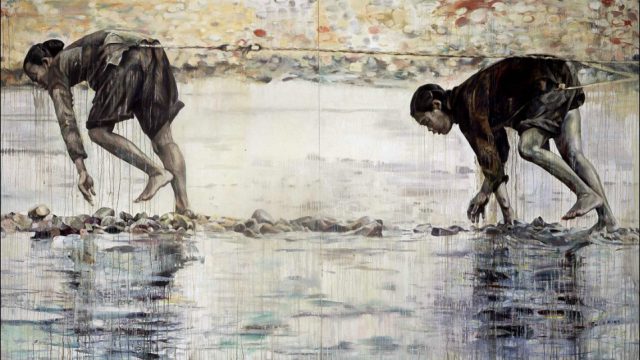 My most recent preoccupation has been with atomic weapons. Intensely rendered with vermillion pastel fingerprints, these weapons have a sinister feeling. Ultimately the final image is composed of thousands of fingerprints, like thousands of bits of evidence.