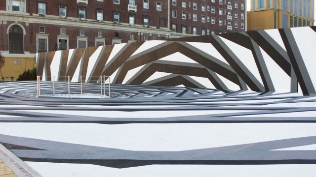 From a distance these installations appear as distinct shapes. Up close they dissolve into linear patterns that shift and change as the viewer's position shifts. Shadows from light sources can create additional visual patterns.
